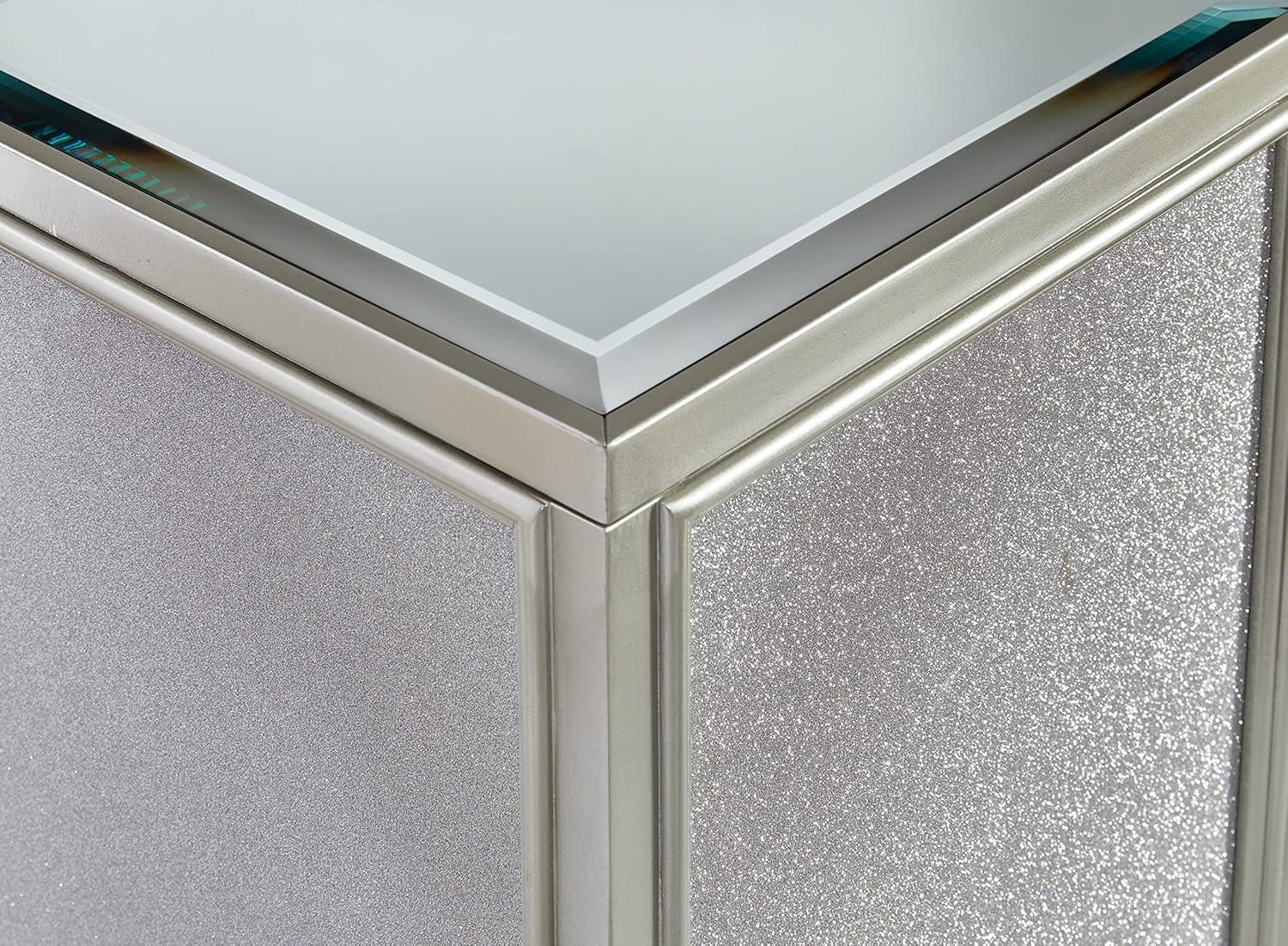 MIRRORED GLASS TABLETOP: Made with wood, engineered wood and textured laminate panels for added luster. The dazzling metallic silvertone finish and beveled inset tabletop team add a touch of glam
