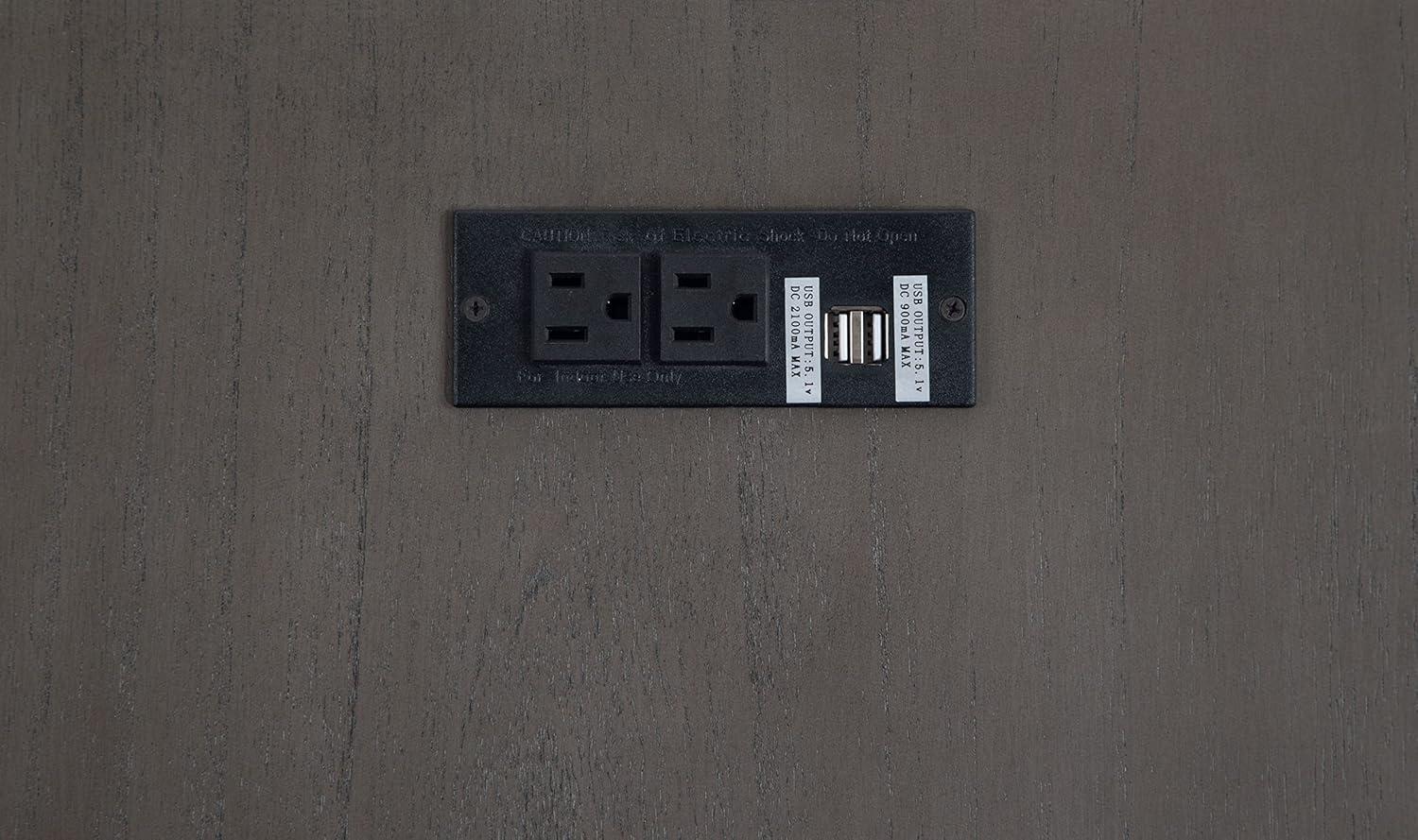 WELL CRAFTED: Made with solid wood, wood veneer and MDF substrate. Includes storage cabinet, open cubby shelf and pull-out tray. 110V power supply with dual USB charging ports