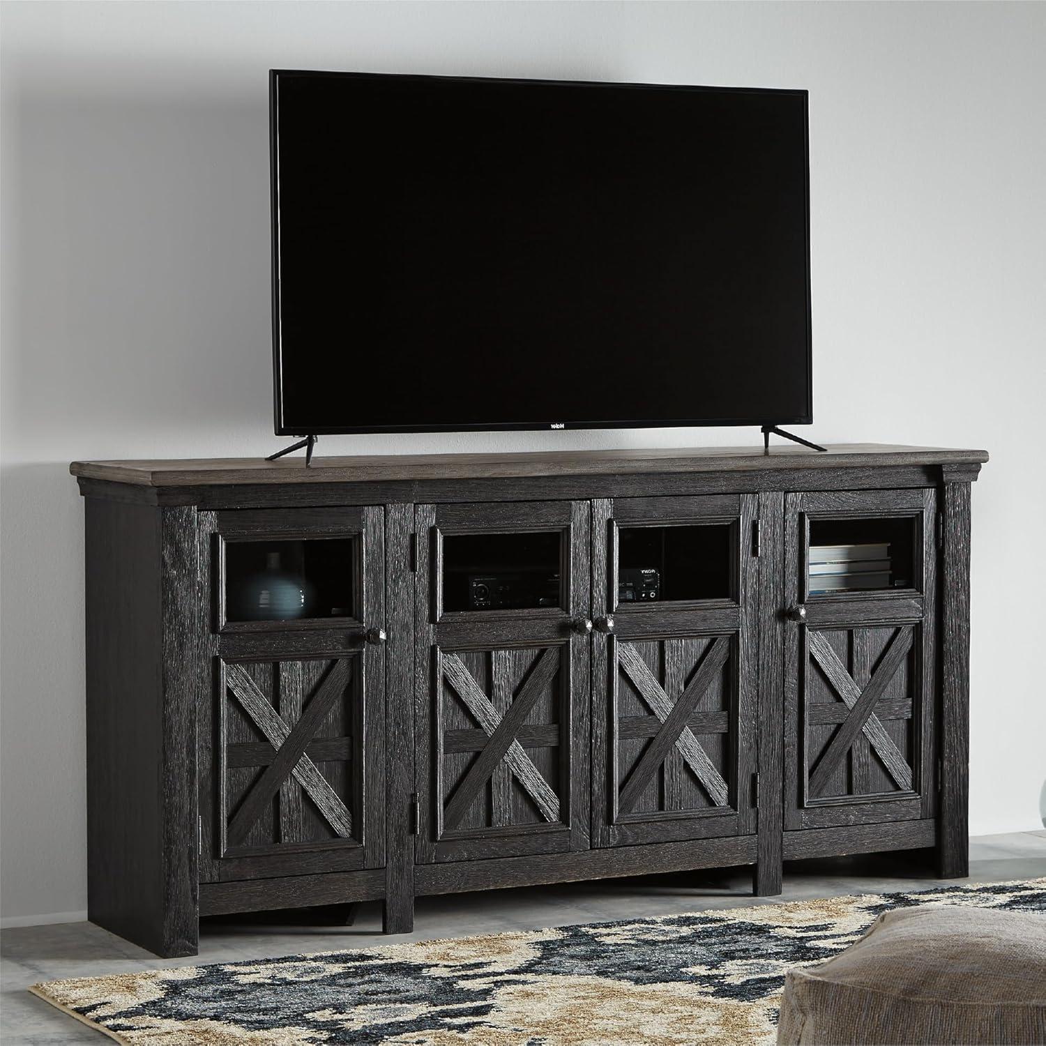 Signature Design by Ashley Tyler Creek Farmhouse TV Stand Fits TVs up to 72″, 4 Glass Doors, 3 Adjustable Storage Shelves, Dark Gray(TV Stand)