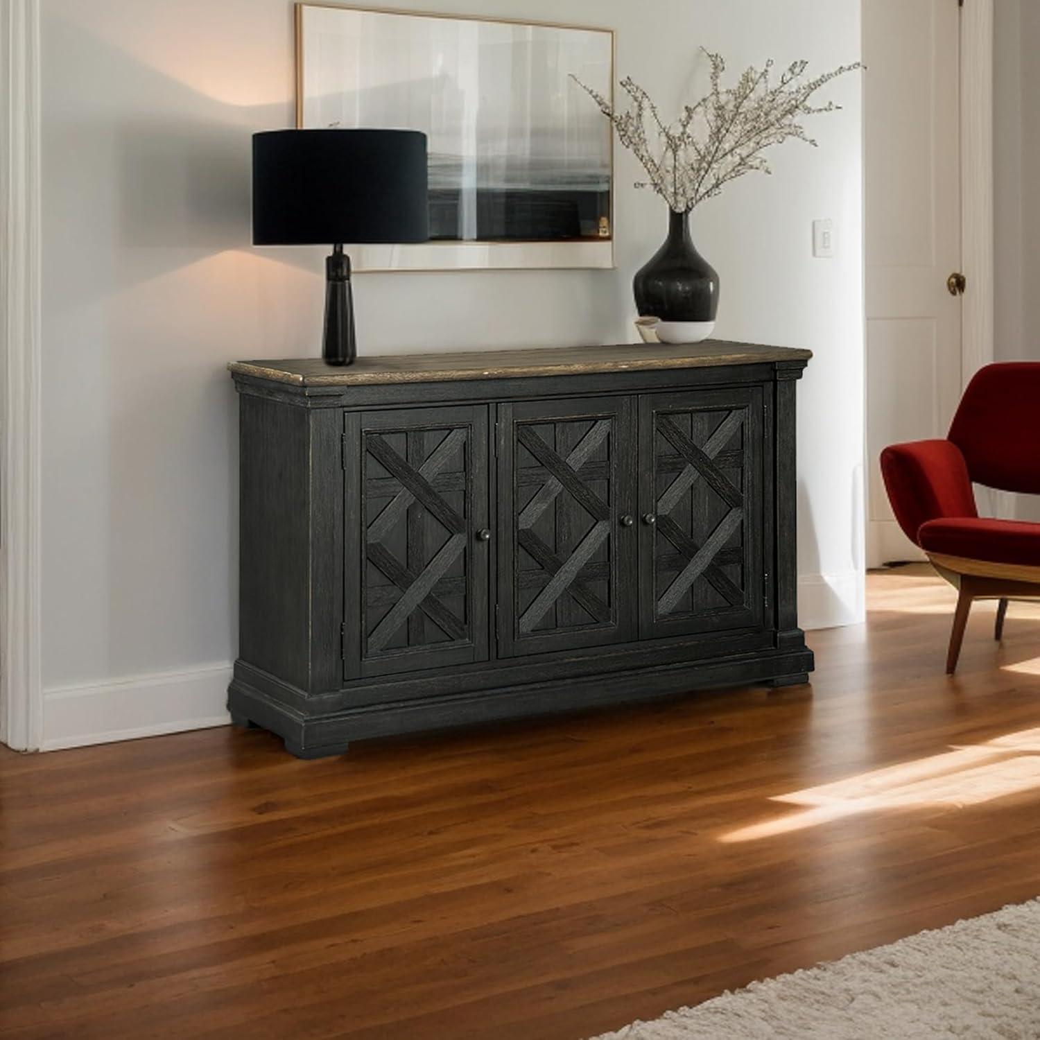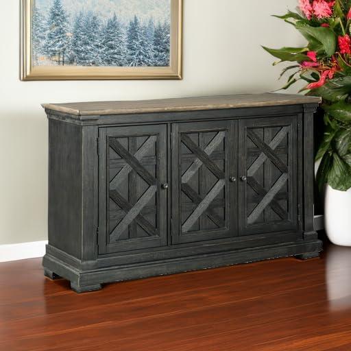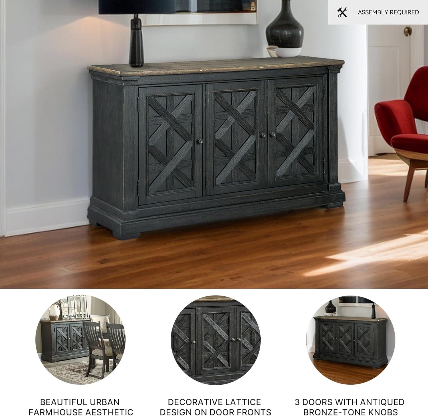 Invite your family into the heart of your home with this dining room server. Black finish is beautifully textured. Timeworn planked oak top creates a unique two-tone contrast. Charming lattice design graces the front of the doors. Store away essentials on the cabinet shelving. Thick pilasters add to the sturdiness of the foundation. This is trend-right urban farmhouse style. From the latest styles of kitchen tables to dining room storage, we combine the latest trends with technology to give you the very best for your home. With unmatched prices and quality, we’re your one-stop destination for furniture, home accents and decor. And we go the extra mile to package, protect and deliver your purchase in a timely manner.