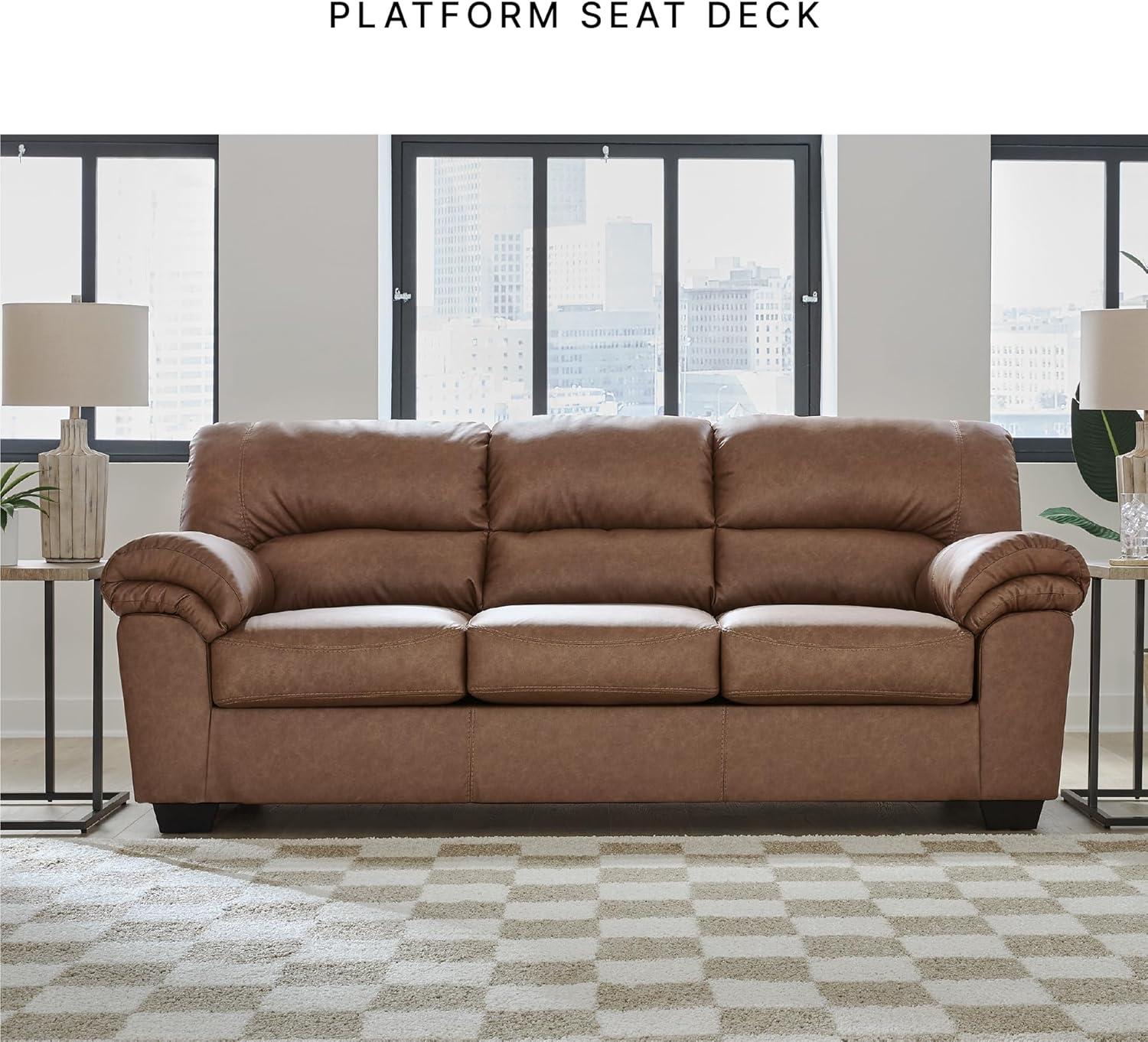 Modern comfort never looked so good. Sporting supremely soft yet durable cushions accented with high-fashion jumbo stitching, this stunning sofa is the ultimate choice in comfortably cool, contemporary style. Its caramel-hued faux leather indulges with an upscale feel and wows like the real thing.