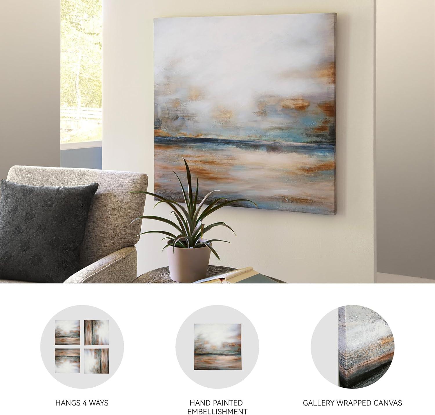 ABSTRACT LANDSCAPE: This simply stunning approach to a classic design graces your space with bright and airy style. Its shades of gray, blue, green, brown and gold are sure to make an impression