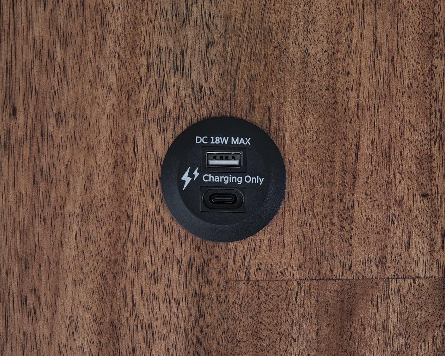 HANDSOMELY CRAFTED: Made with hardwood solids, mango wood veneer and MDF substrates. Smooth-gliding drawer with fully finished interior, dovetail construction and heavy-duty ball-bearing side glides. Open shelf. USB-A and USB-C charging ports