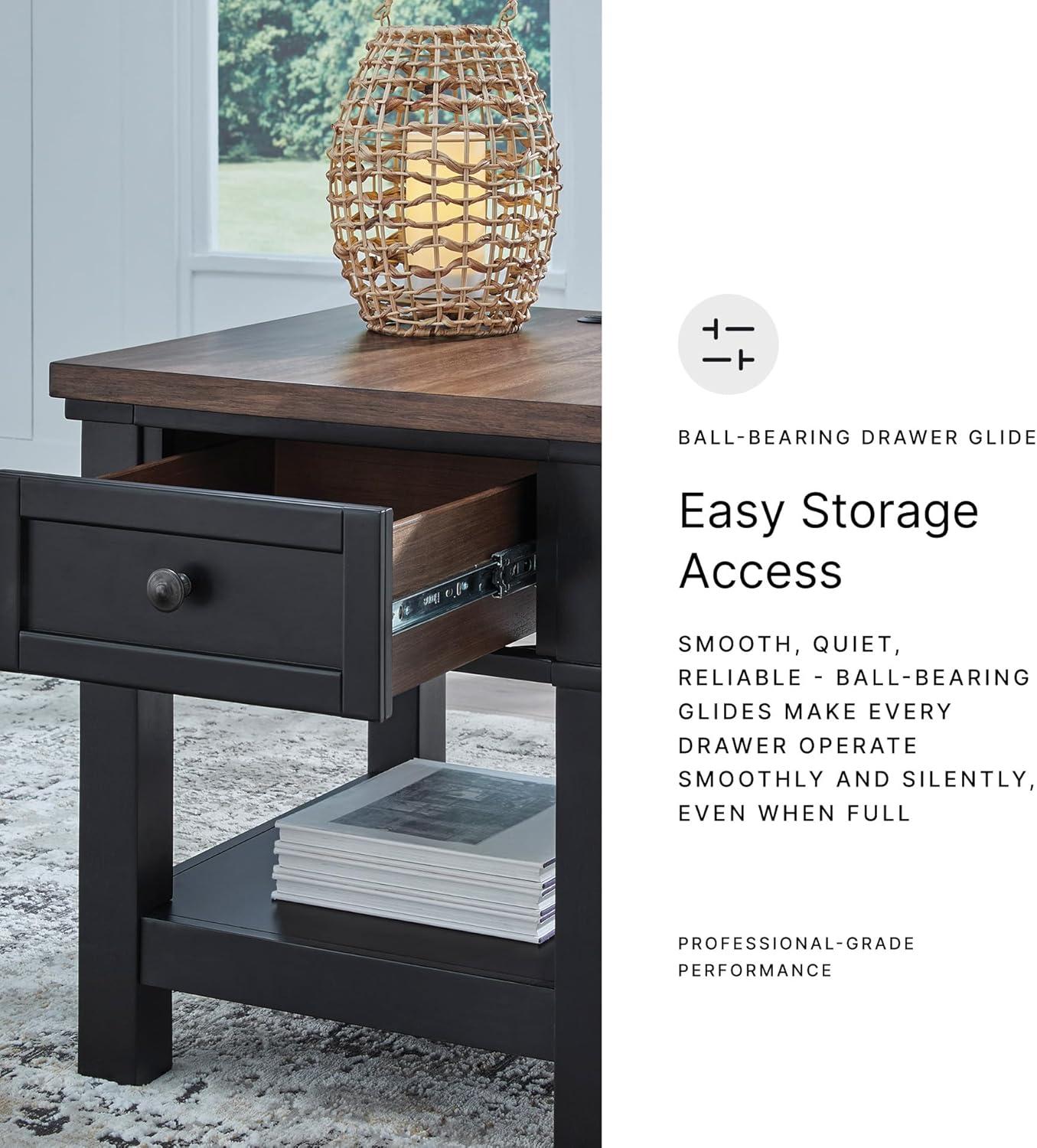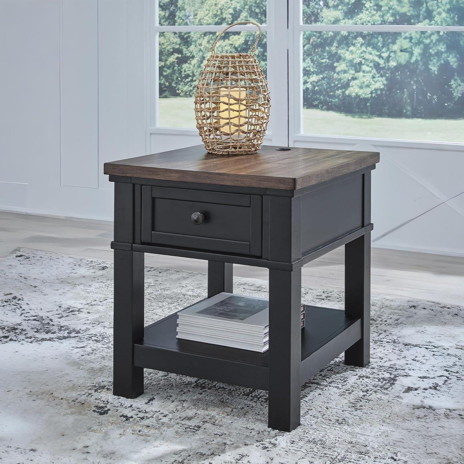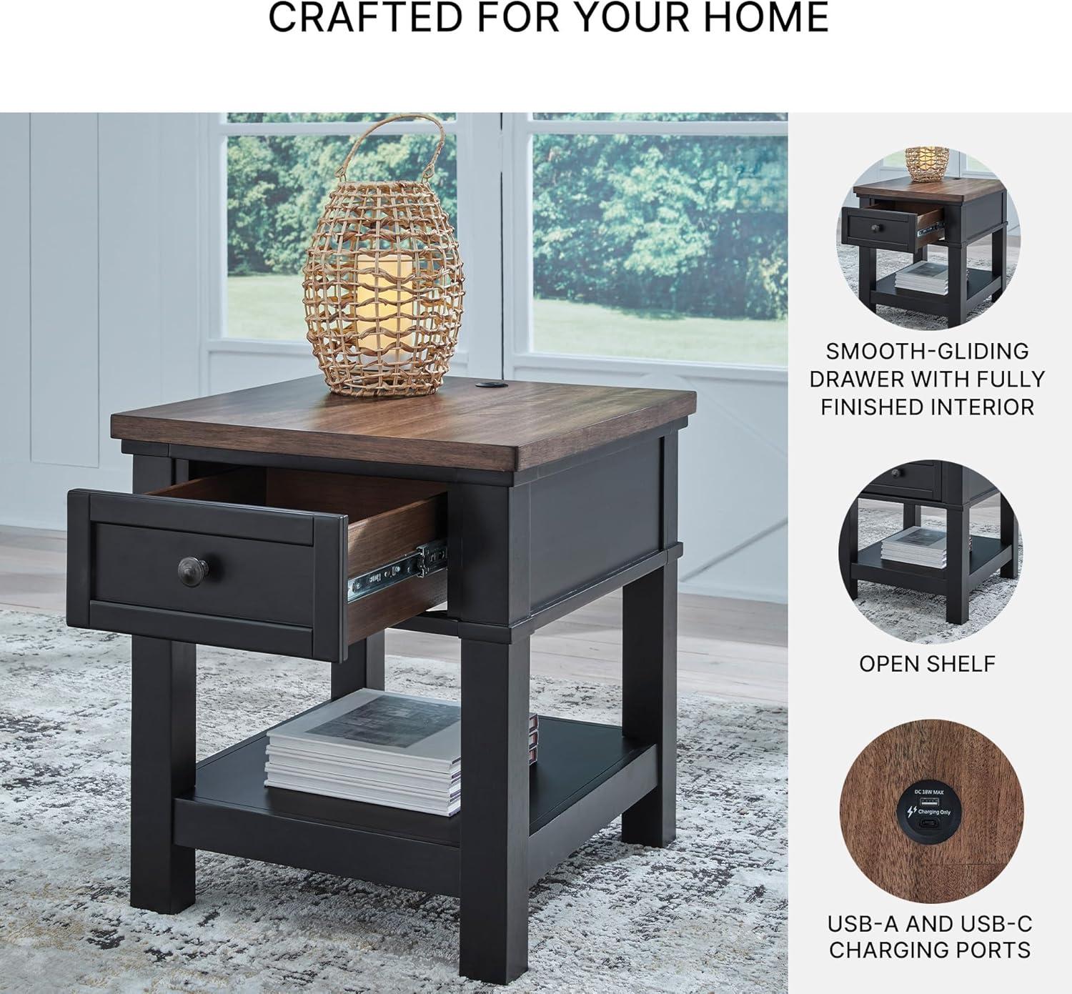 END TABLE: Raise the bar on modern farmhouse style with this table. Its sturdy silhouette and casual good looks are accentuated with a two-tone finish. A storage drawer and USB charging ports keep devices powered up and close at hand