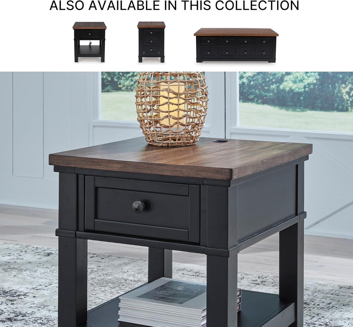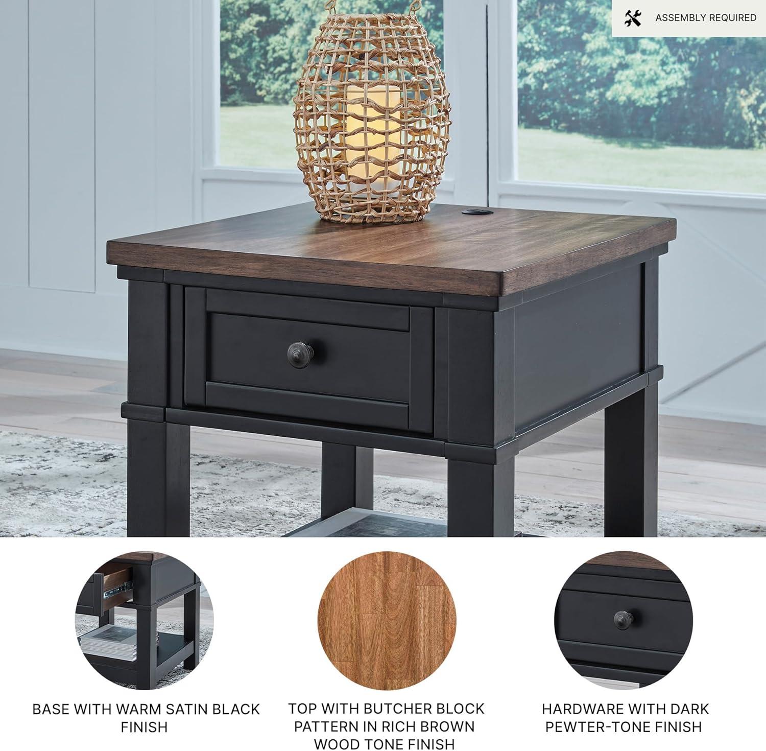Raise the bar on modern farmhouse style with this end table. Its sturdy silhouette and casual good looks are accentuated with a two-tone finish, which pairs a warm satin black base with a contrasting butcher block veneer top. A spacious storage drawer and dual USB charging ports keep devices powered up and close at hand. Whether your style is vintage, country or eclectic, this table adds a hearty element.