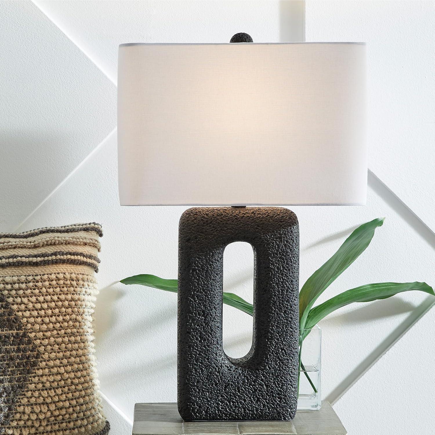 HANDSOMELY CRAFTED: Each is made of polyresin with a rectangular hardback fabric shade. A textured black finish, cutout base and sleek rectangular shade elevate them to an art form