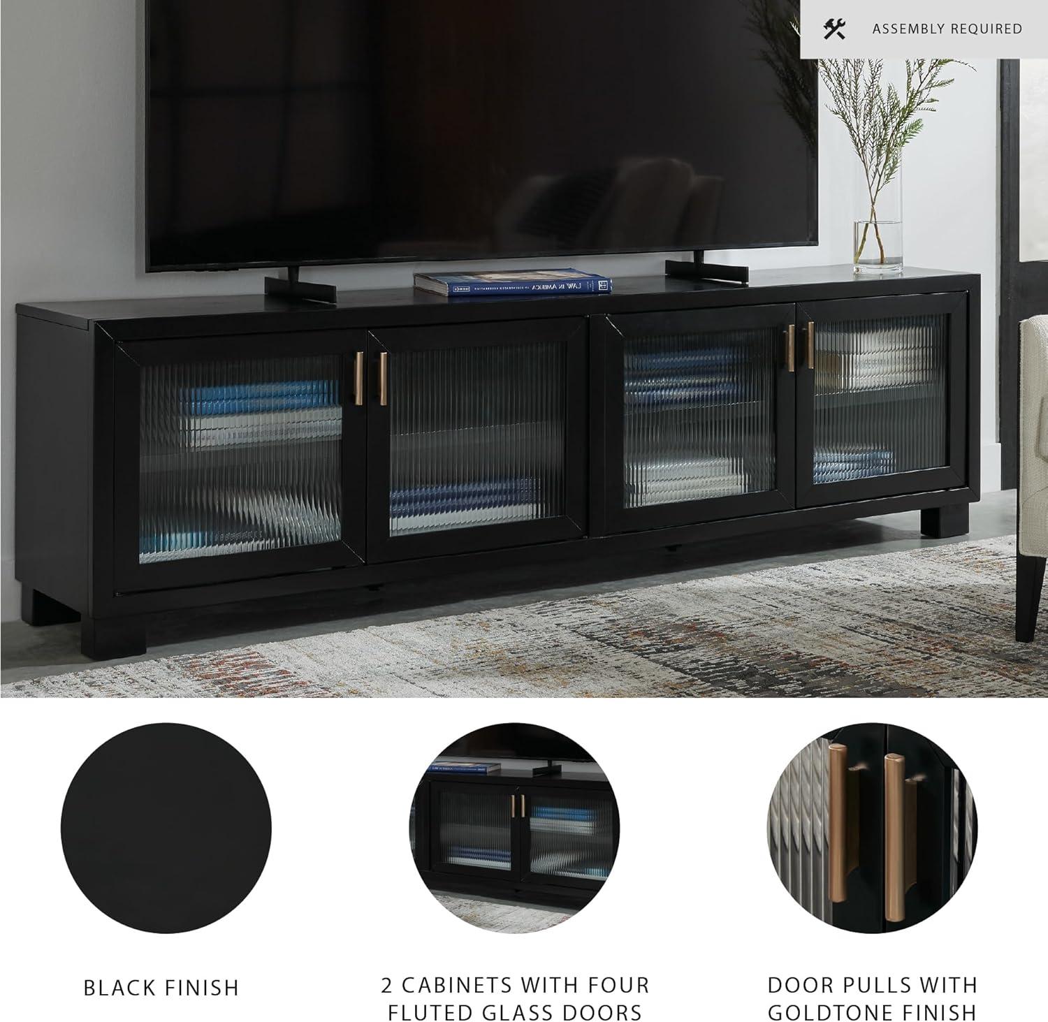 HANDSOMELY MADE: Hardwood solids, mindi veneer & MDF substrate. Black finish. 2 cabinets with 4 fluted glass doors. 2 adjustable shelves. Door pulls with goldtone finish. Cutouts for cord management