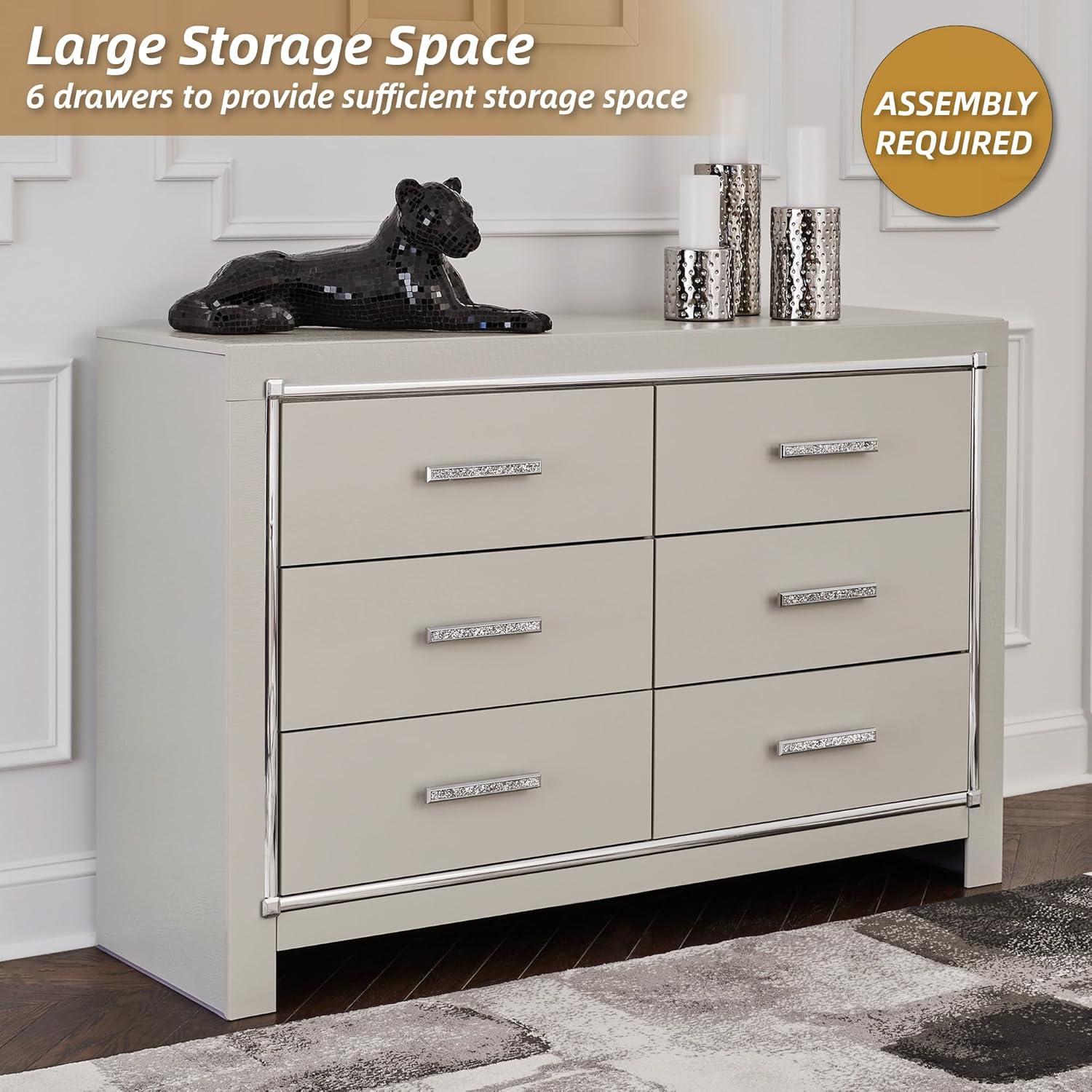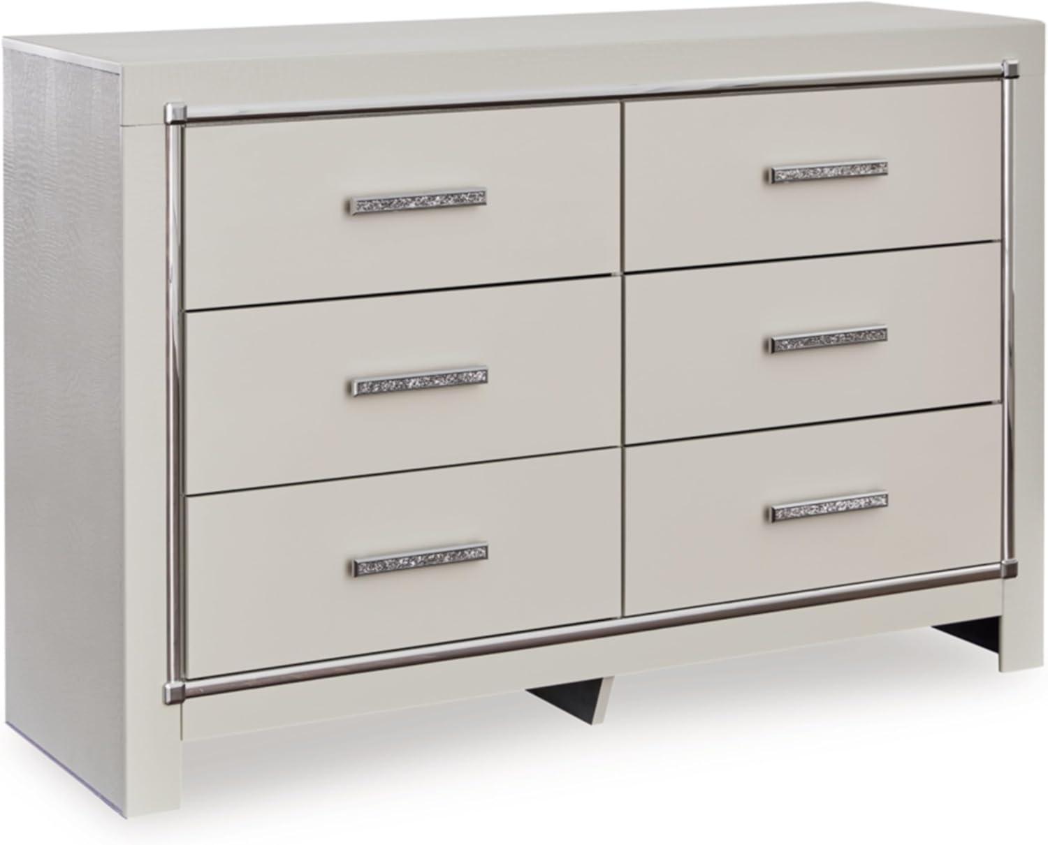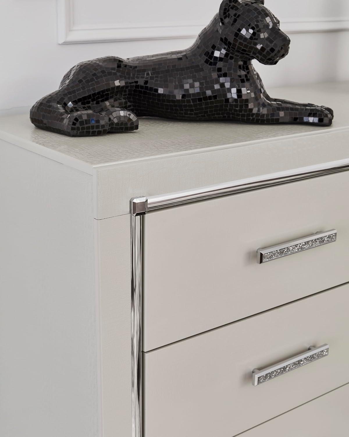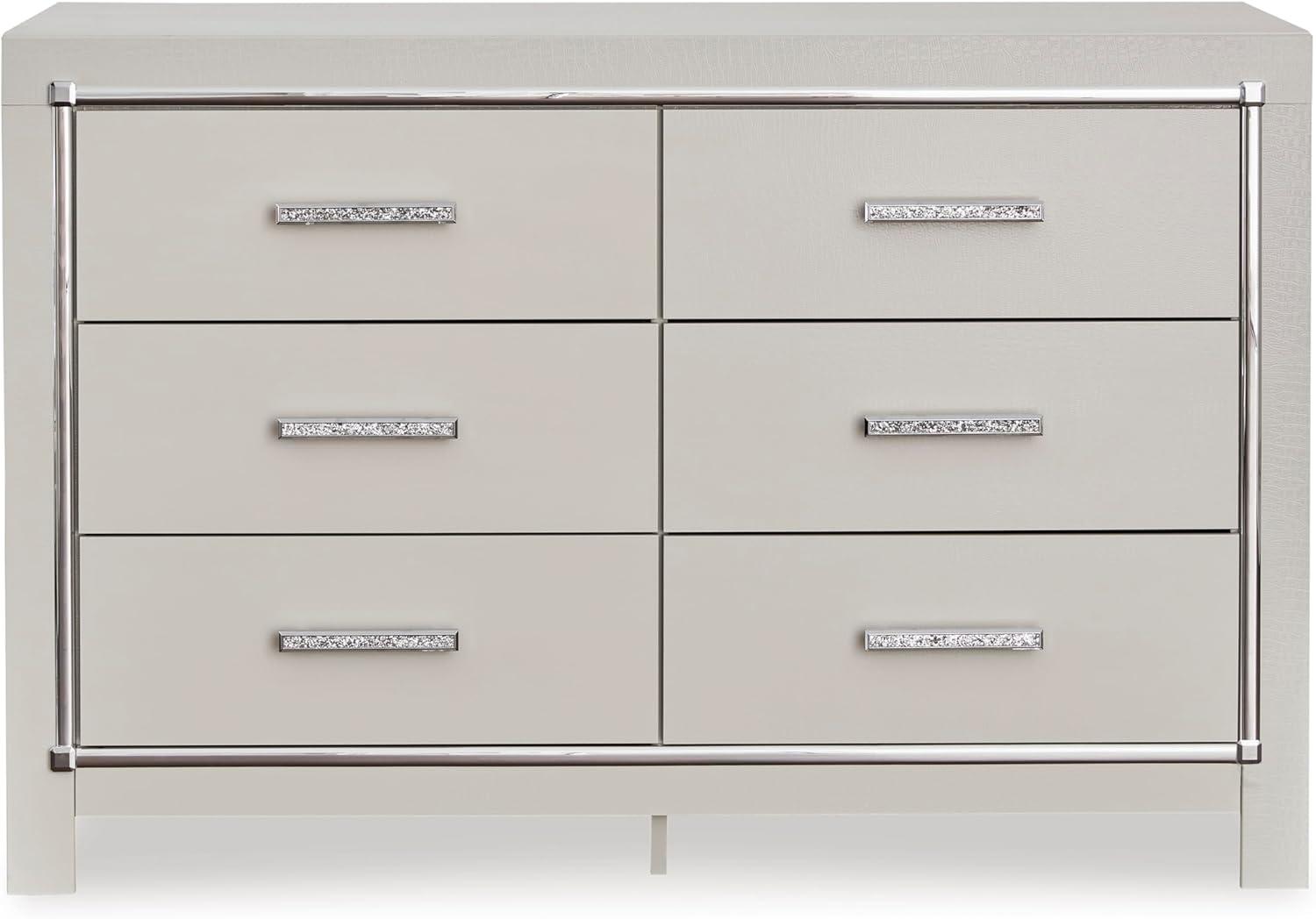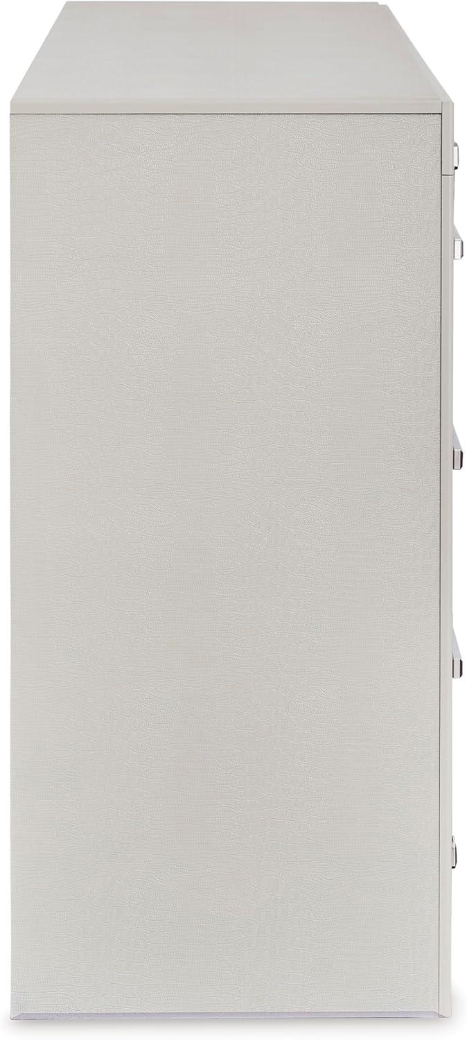 Bright, bold luxury. This dresser dazzles with its attention to detail. Your love of glamorous style is reflected in its all-over faux gator pattern in a metallic finish, exquisitely paired with faceted chrome-tone details. Complete with smooth-gliding storage drawers, it inspires you to live luxuriously every day—whether dressing up to go out or dressing down to stay in. Signature Design by Ashley is a registered trademark of Ashley Furniture Industries, Inc.