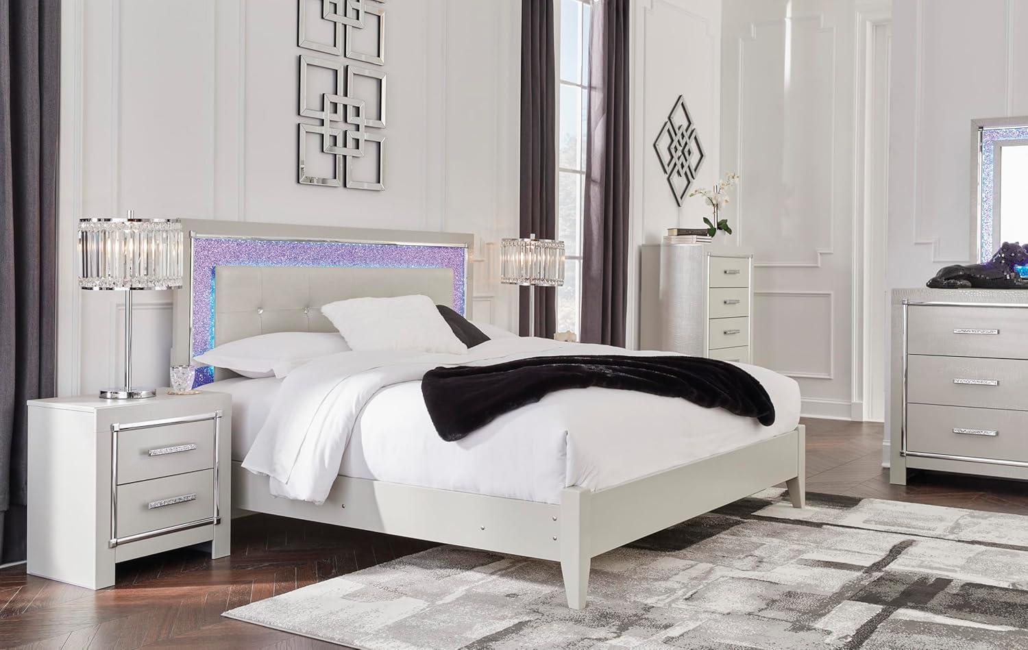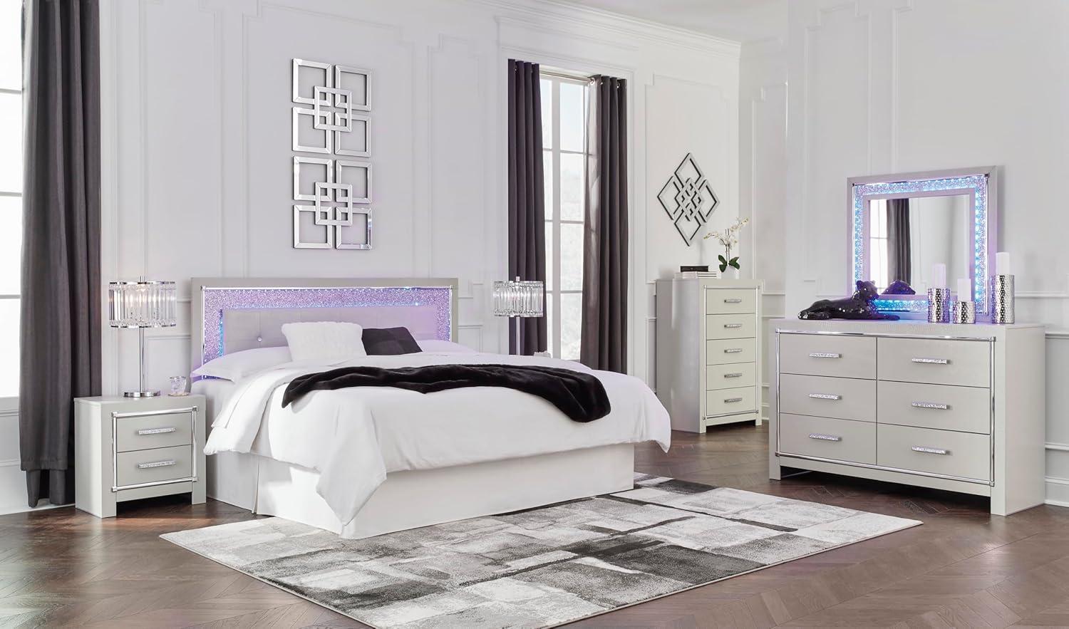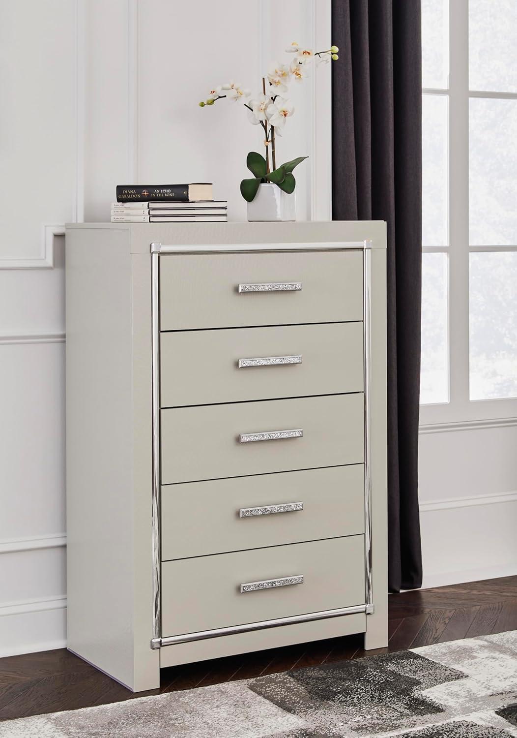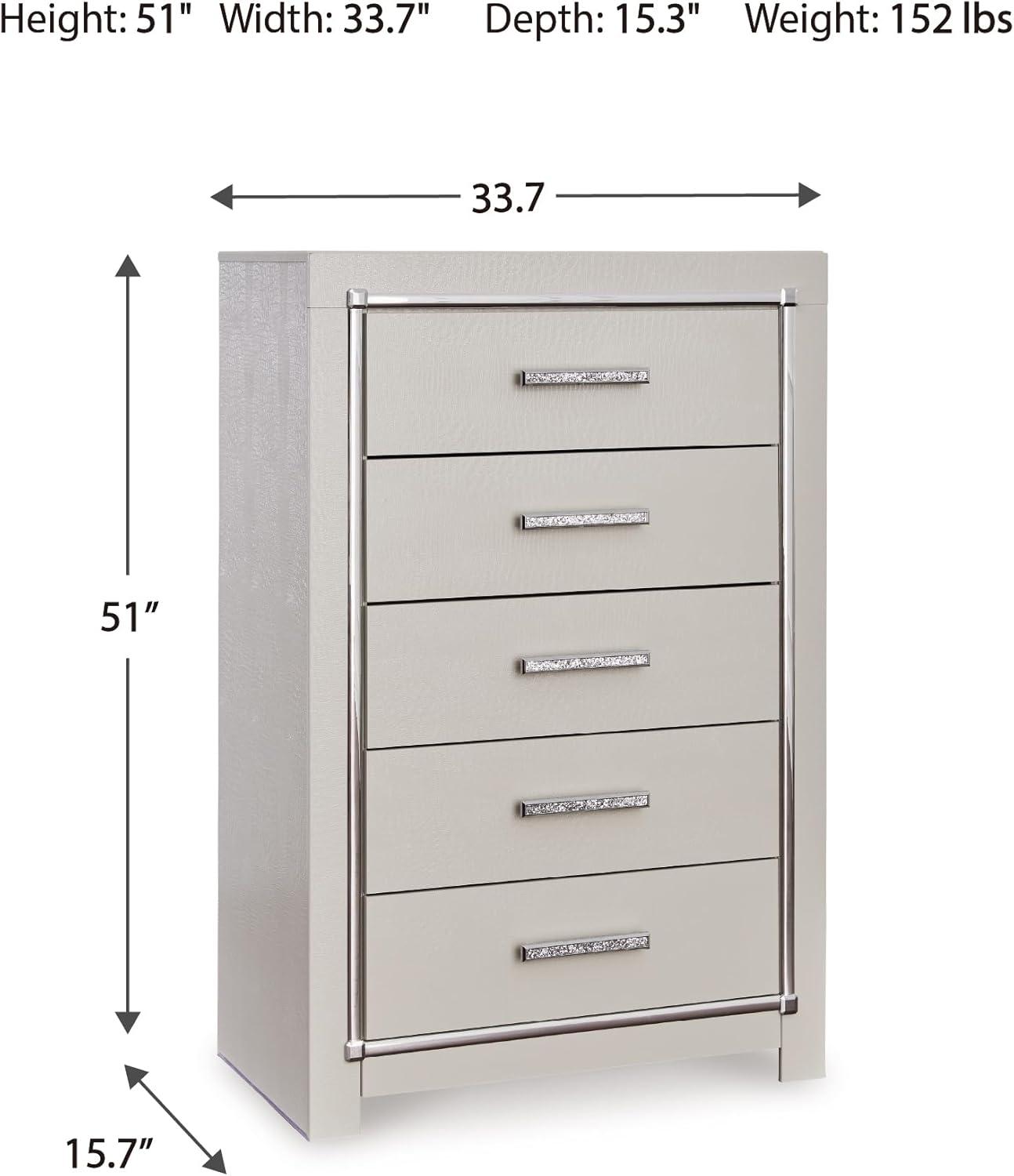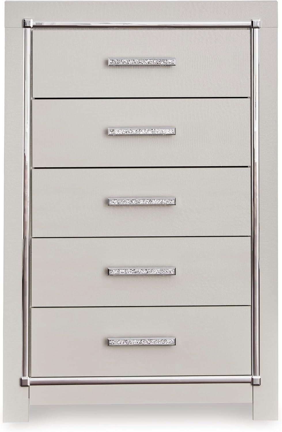 Bright, bold luxury. This dresser dazzles with its attention to detail. Your love of glamorous style is reflected in its all-over faux gator pattern in a metallic finish, exquisitely paired with faceted chrome-tone details. Complete with smooth-gliding storage drawers, it inspires you to live luxuriously every day—whether dressing up to go out or dressing down to stay in. Signature Design by Ashley is a registered trademark of Ashley Furniture Industries, Inc.